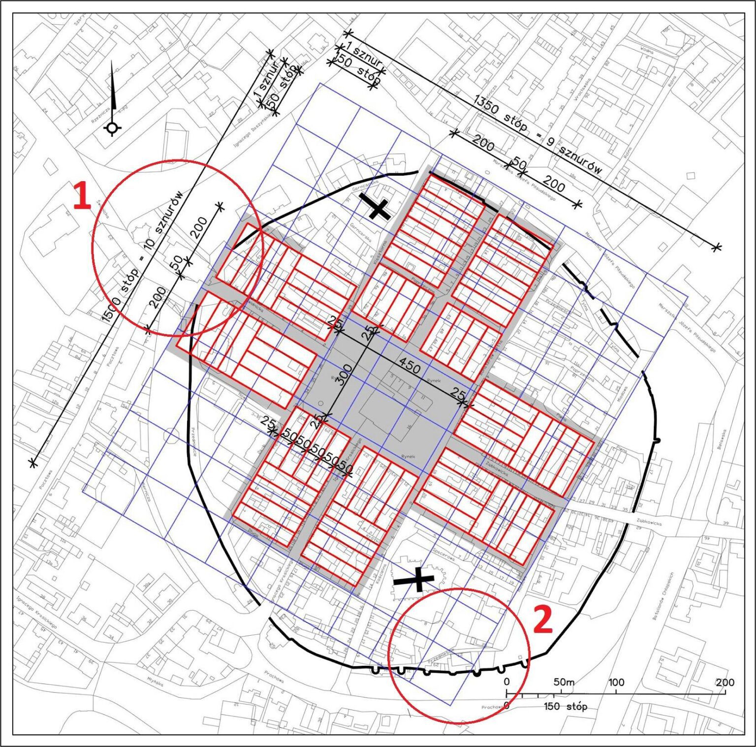rekonstrukcja parcelacji z czasów lokacji miasta z zaznaczeniem obu zamków: 1 – zamek książęcy, 2 – zamek wójtowski/Hummel (opr. Małgorzata Chorowska, Katalog Zamków i Dworów Obronnych Śląska [ https://zamki.pwr.edu.pl/ ]. Licencja: CC BY-NC 4.0 [ https://creativecommons.org/licenses/by-nc/4.0/ ])