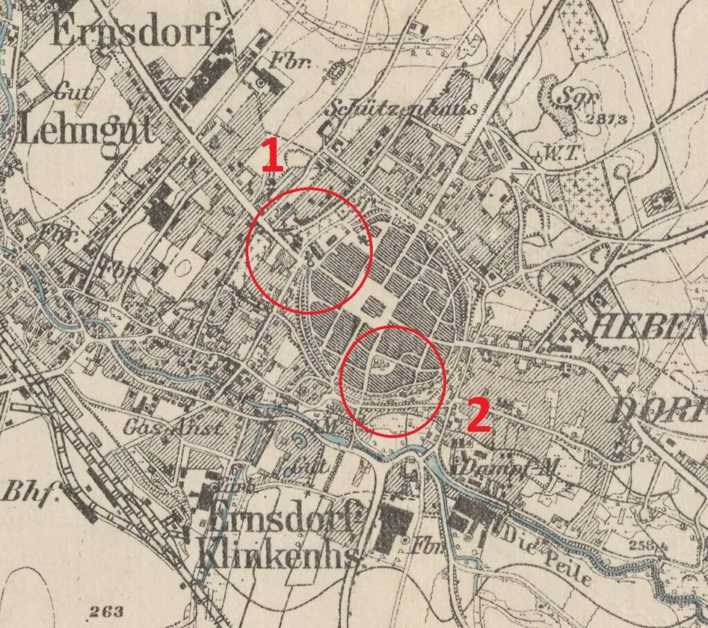 DZIERŻONIÓW, lokalizacja zamków na fragmencie przedwojennej mapy katastralnej Mestischblatt., ark. Reichenbach, wyd. w 1919 r.: 1 – zamek książęcy, 2 – zamek wójtowski/Hummel (opr. Piotr Błoniewski, Katalog Zamków i Dworów Obronnych Śląska [ https://zamki.pwr.edu.pl/ ]. Licencja: CC BY-NC 4.0 [ https://creativecommons.org/licenses/by-nc/4.0/ ])