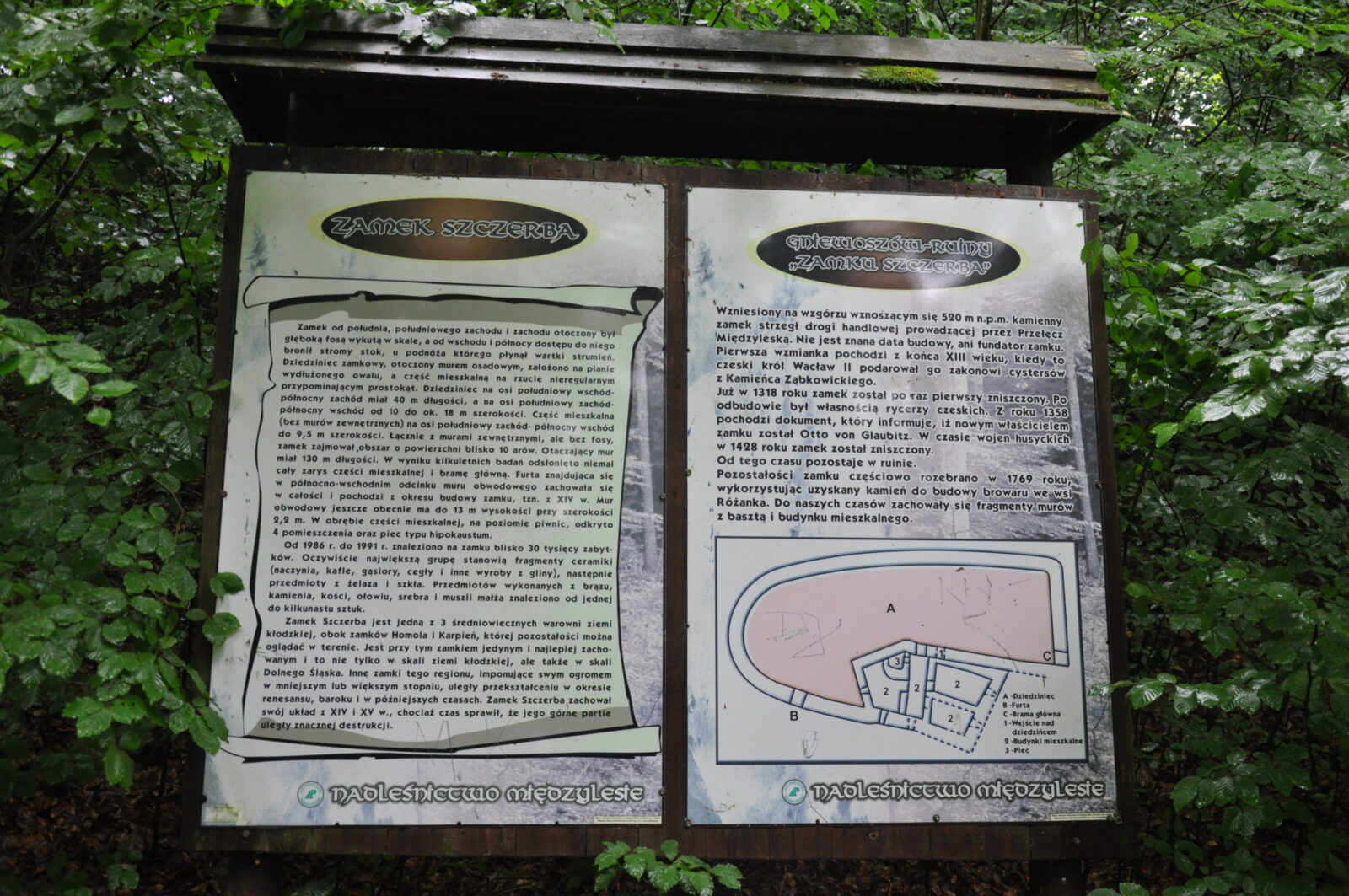 Zamek Szczerba zbudowano pod koniec XIII wieku z nieobrobionego kamienia, na obrysie nieregularnego owalu, w kształcie podkowy, prosto ściętego w kierunku zachodu, z występem na północ. Mury obronne o długości ponad 100 m, wysokości 9 m i grubości około 1,5 m otaczały niewielki dziedziniec zamkowy o długości 40 m i szerokości 10-18 m. Od południa, południowego zachodu i zachodu otaczała mury zamkowe głęboka sucha fosa wykuta w skale. Całość powierzchni zamku wynosiła około 1000 m². Do zamku prowadziła droga przez most zwodzony nad fosą i wąską bramę o szerokości 3 m, natomiast w północnym odcinku muru zachodniego mieściła się wąska brama boczna prowadząca na zamkowy dziedziniec. Do północnej strony muru przylegały dwukondygnacyjne zabudowania mieszkalne, zbudowane na planie zbliżonym do czworoboku o wymiarach 9,5 x 19,5 m, posiadające cztery pomieszczenia mieszkalne. Część mieszkalna zamku była podpiwniczona. Ciasny dziedziniec mieścił w północno-wschodnim narożniku wieżę, a przy murze znajdowały się stajnie, zabudowania gospodarcze i pomieszczenia dla załogi. Historia powstania i funkcjonowania warowni położonej w pobliżu wsi Gniewoszów okryta jest cieniem tajemnicy, niewiele zachowało się dokumentów mówiących o dziejach i losach historycznych tego zamku. Nieznany jest również fundator, ani czas, w którym powstał pierwszy zamek. Według legend na miejscu obecnego zamku już na początku XI wieku istniał niewielki gród. Kamienny zamek został zbudowany w późniejszym okresie przez polskich rycerzy. Pod koniec XIII wieku, czeski król Wacław II podarował zamek zakonowi cystersów z Kamieńca Ząbkowickiego, ale zamek nie był długo w rękach zakonu, ponieważ w 1318 roku został po raz pierwszy zniszczony. Po odbudowie w drugiej połowie XV stulecia zamek objęli w posiadanie rycerze czescy. W 1358 właścicielem zamku i okolicznych dóbr był Otto Schuler, syn wywodzącego się z Łużyc rycerza Ottona von Glaubitza, właściciela Międzylesia. Rodzina Glaubitzów prawdopodobnie otrzymała tę posiadłość na początku XIV wieku, w związku z objęciem ziemi kłodzkiej przez Jana Luksemburskiego. Do 1428 panem na Szczerbie był Bernhard Glaubitz, starosta kłodzki. W 1428 r. oddziały husyckie zdobyły i zniszczyły małą warownię, której nigdy już nie odbudowano. Tradycyjnie przez następne wieki zamek spełniał funkcję tytularnej siedziby zarządu dóbr międzyleskich. Potem przez stulecia zmieniali się właściciele zamkowych ruin: od sołtysów pobliskiego Gniewoszowa, przez Paula Prebira, rodzinę von Tschirnhaus, hrabiów von Althann, baronów von Stillfried. W XIX stuleciu właścicielami ruin byli: hrabia von Magnis oraz księżna Marianna Orańska, pani na zamku w Kamieńcu. W rękach jej potomków, bocznej linii Hohenzollernów, zamek pozostawał do 1945 r. Zamek ”Szczerba” należy do grupy tych pechowych zamków, których byt zakończył się po kilkudziesięciu latach funkcjonowania. Obecnie budowla stanowi dobrze czytelną ruinę. Do dziś mimo upływu przeszło pięciu stuleci zachowały się obszerne fragmenty: grubych obronnych murów obwodowych, których wysokość sięga miejscami 9 metrów, baszta, dziedziniec, oraz pozostałości kamiennego budynku mieszkalnego i bramy. Wokół zamku widoczne są pozostałości po suchej fosie. Malowniczy obiekt znajduje się po lewej stronie drogi prowadzącej z Międzylesia do Gniewoszowa, kilkaset metrów na północ od wsi Różanka, zasłonięta drzewami ruina w miesiącach jesienno-zimowych jest widoczna z pobliskiej drogi, ale łatwo można ją przeoczyć, ponieważ kamienne mury zupełnie zlewają się z licznie porozsiewanymi w okolicy zamku gnejsowymi skałkami.