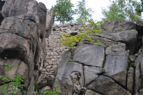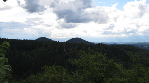 A tu widok z zamku na dwa szczyty: Sokolika i Krzyżną Górę, u której podnóża znajdują się ruiny (fragmenty muru) kolejnego zamku.
