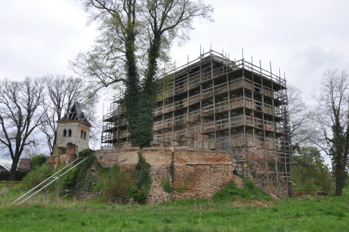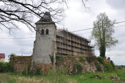 Murowany zamek został zbudowany na przełomie XIII/XIV wieku na miejscu, prawdopodobnie starszego założenia. Jego fundatorem mógł być Henryk I, zamek został przejęty potem przez księcia Jana Głogowskiego. Zajmuje on owalne wyniesienie 35x45m. Ze średniowiecznej zabudowy do dnia dzisiejszego zachowały się wieża i mur obwodowy. Wieża jest wzniesiona na planie prostokąta 10,5x12,5m, posiada przesklepiona piwnicę. Na poziomie parteru w ścianie zachował się pierwotny otwór wejściowy. W pozostałych ścianach widoczne są szczelinowe otwory okienne. Pierwotnie zamek otoczony był dwoma wałami i dwiema fosami, a dojście do niego zapewniała grobla. Po zniszczeniu zamku w 1642 roku, w XVIII wieku został on przebudowany na zbór ewangelicki. Na przełomie XVIII/XIX wieku zasypano fosy oraz częściowo zniwelowano wały.