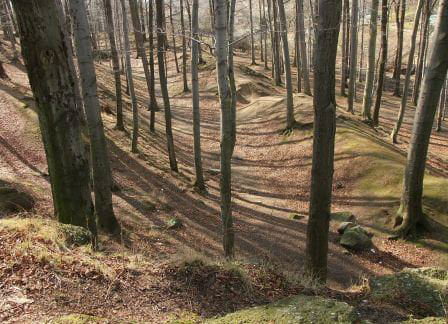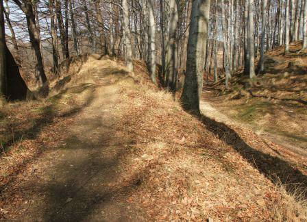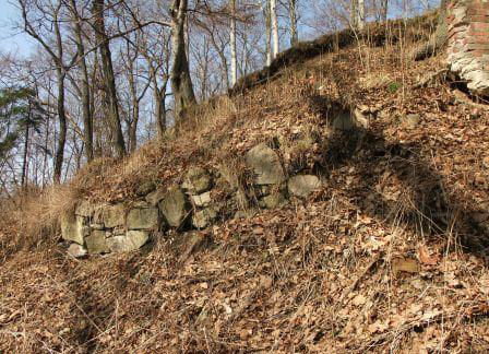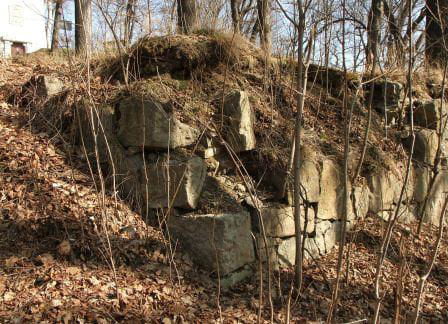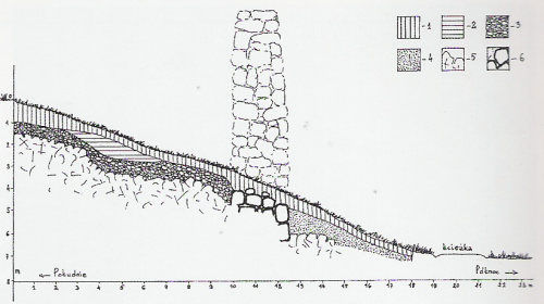 przekrój przez północny stok wzgórza: 1-humus, 2-glina, 3-gruz gnejsowy, 4-drobny żwir, 5-lita skała, 6-mur kamienny łączony zaprawą wapienną