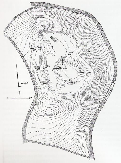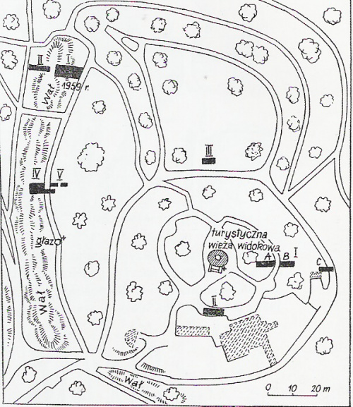 Wzgórze Krzywoustego z zaznaczeniem wykopów archeologicznych