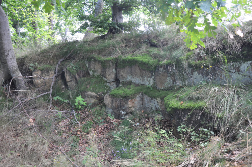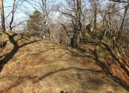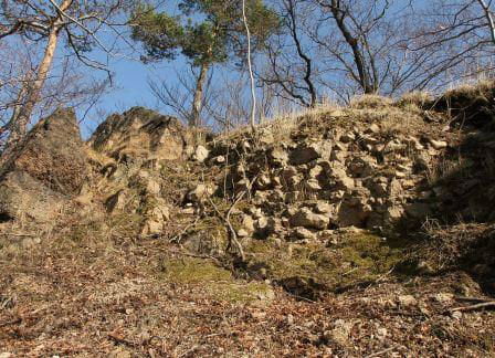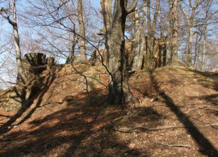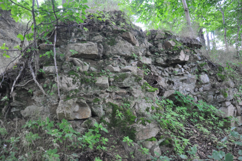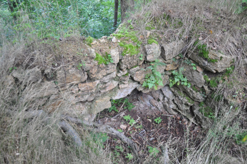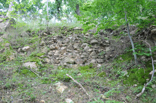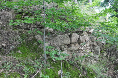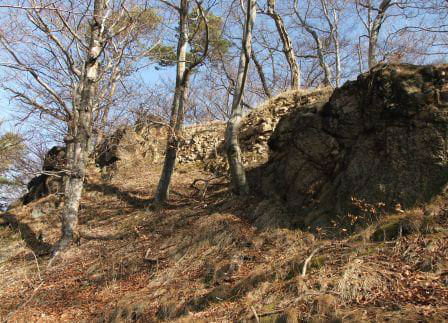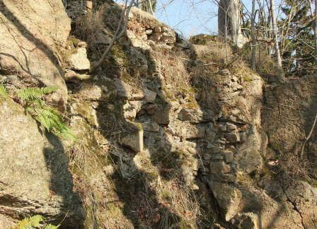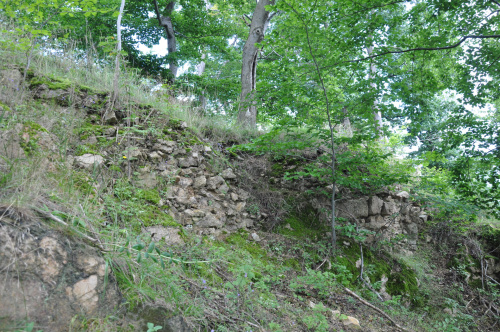 Z zamku zachowały się 3 fragmenty muru. Ruiny żelaznej wieży widokowej widocznej na zdjęciach tego miejsca jeszcze sprzed kilku lat już nie ma. (fot. marzec 2012)