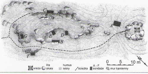 plan pozostałości zamku z zaznaczeniem wykopów sondażowych, rys. S.Firszt za WILK1998, plan nie uwzględnia tarasu na zachód od głównej kulminacji, zaznaczona na nim wieża nie istnieje