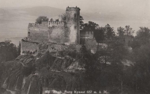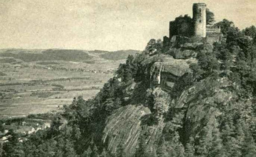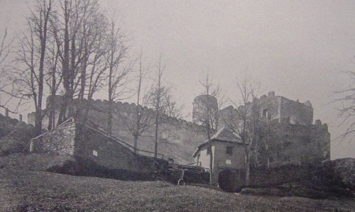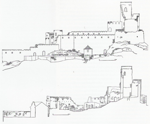 Elewacja północno-zachodnia oraz poniżej przekrój przez zamek górny, dolny i basteję. Na przekroju na zamku górnym po prawej zaznaczono mury obronne z chodnikiem dla straży, wieżę ostatecznej obrony z oryginalnym, ostrołucznym wejściem oraz cysternę na wodę. Na dolnym dziedzińcu widoczny jest zrujnowany budynek kuchni z wysokim, ostrosłupowym kominem w południowej części bastei (po lewej) widnieje schronisko z 1860 roku