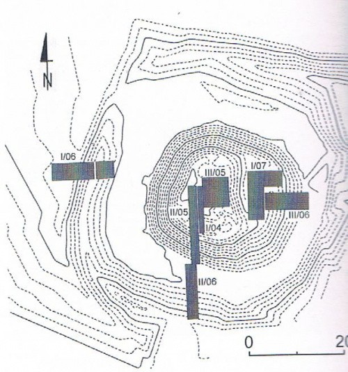 Prowadzone na obiekcie badania archeologiczne wykazały, że najstarszą fazę założenia stanowi piaszczysta warstwa o maksymalnej miąższości nieci ponad 1m usypana na drewnianym podkładzie. Badania prowadzone w ramach wykopu nr III/2006 założonego w obrębie fosy wykazały, że podnóże stożka wzmacniał rodzaj suchego muru oporowego , wykonany z kamieni polnych łączonych gliną zachowany do wysokości 1,3m. Najwięcej danych odnośnie sposobu zagospodarowania majdanu kopca dostarczyły prace realizowane w ramach wykopu I/2007, zlokalizowane w jego E części.