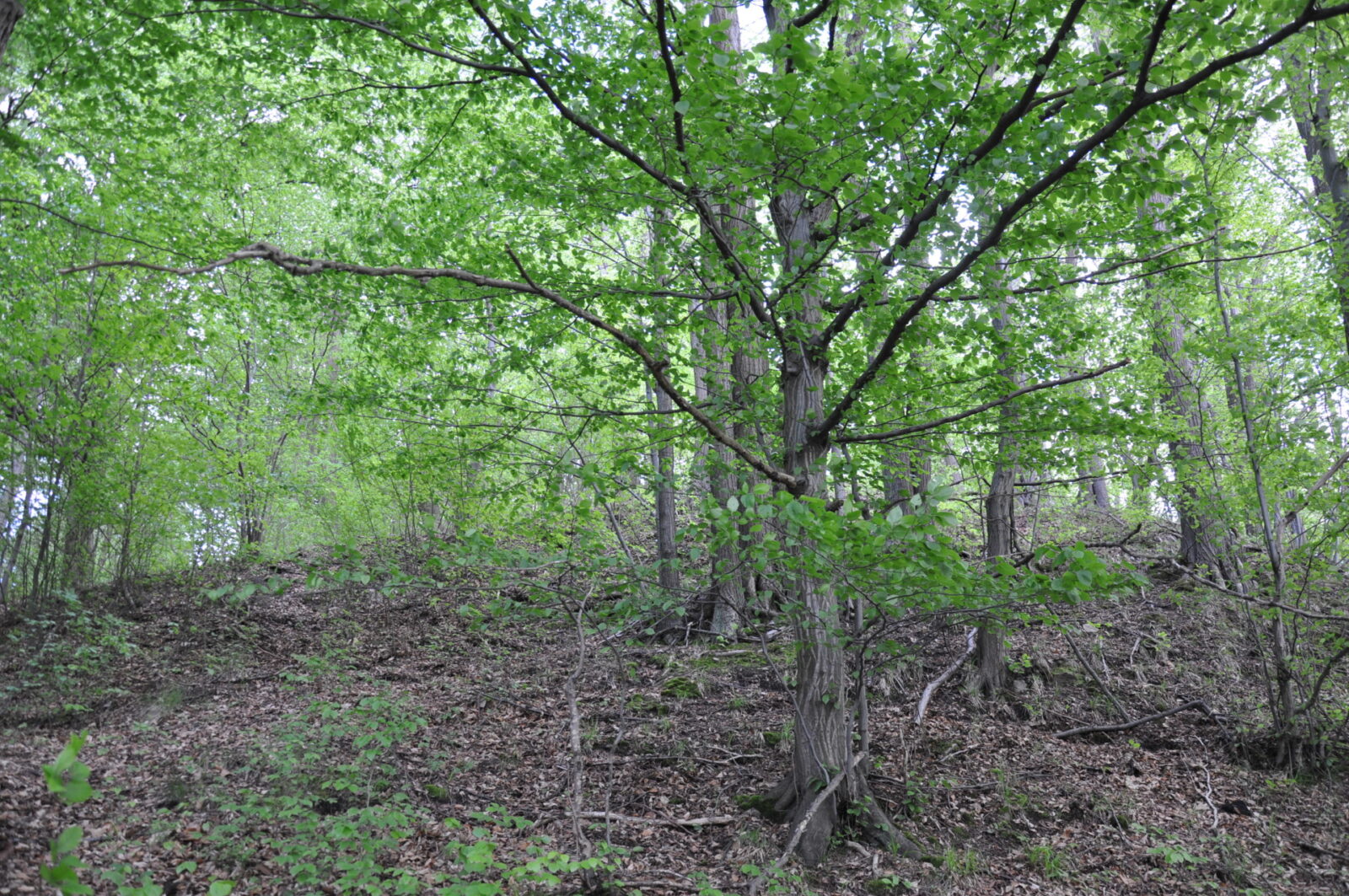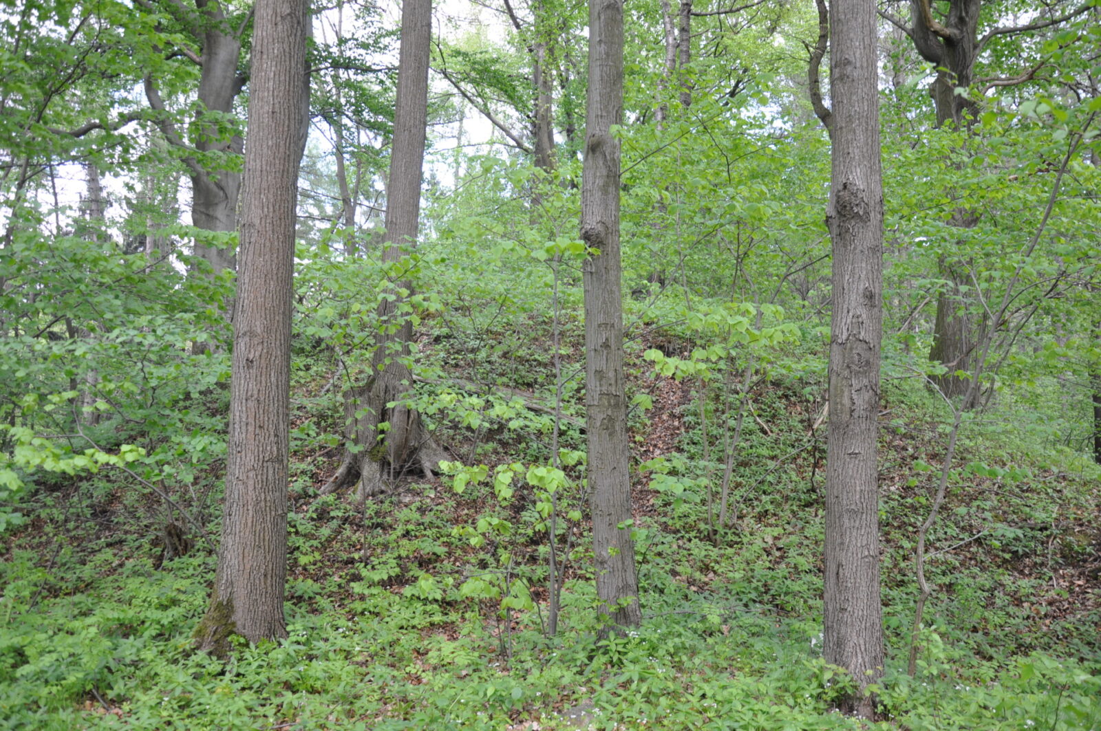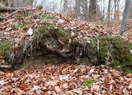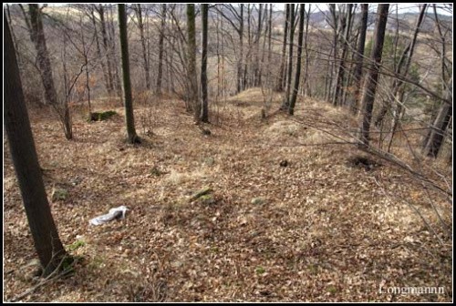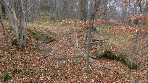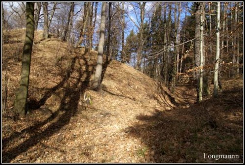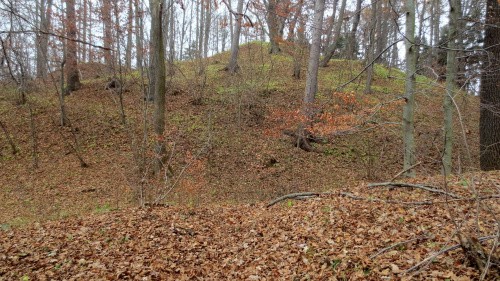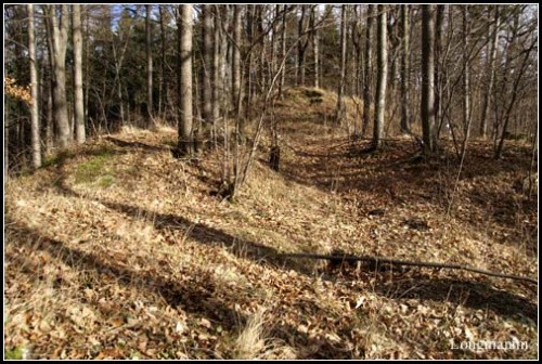 Przy wzgórzu znajduje się parking na kilka aut, dojście do ruin nie jest jednak w żaden sposób oznakowane, idziemy „na krechę”, do góry i przez las.(fot. grudzień 2014)