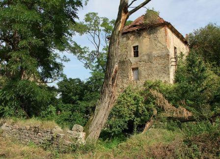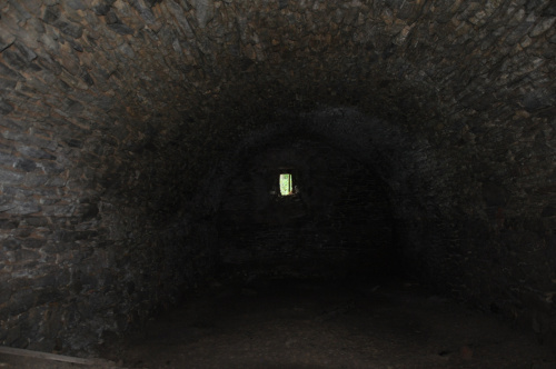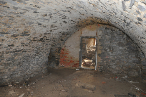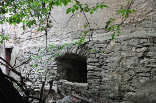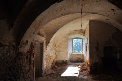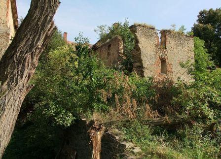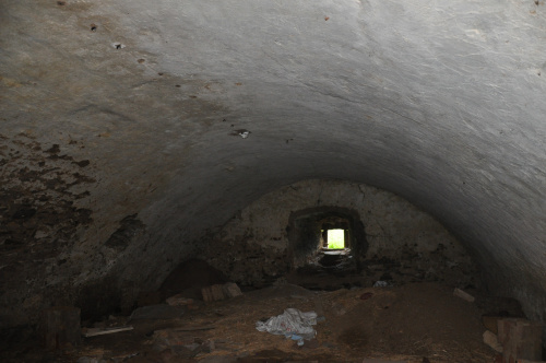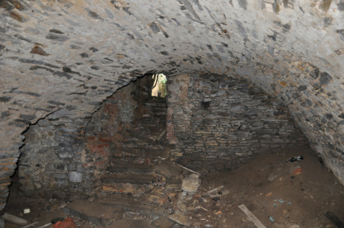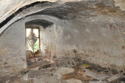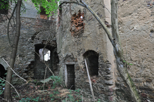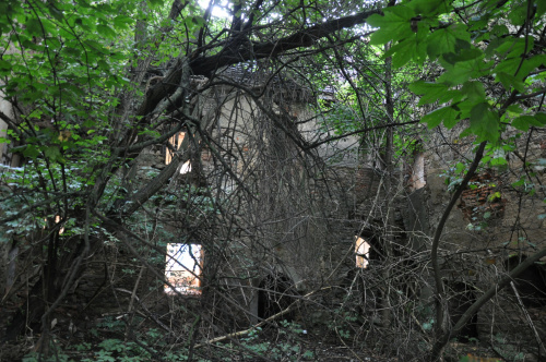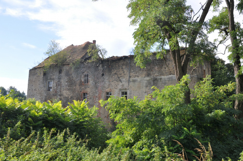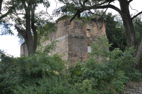 Ponieważ zamek leży na terenie prywatnym, można do niego dostać się na dwa sposoby. Albo od strony pola, gdzie jednak trzeba się przedrzeć przez pokrzywy i inne krzaczory, albo bezczelnie wejść przez bramę na teren PGR-u i liczyć na to, że nikt się nami nie zainteresuje. Do środka nie wchodziłem z uwagi na brak możliwości przejścia przez ścianę zieleni bez maczety. (fot. wrzesień 2011)