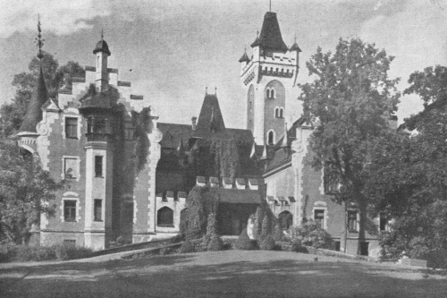 Przebudowany w neorenesansowym stylu zamek w Nowym Kościele na przedwojennej pocztówce.