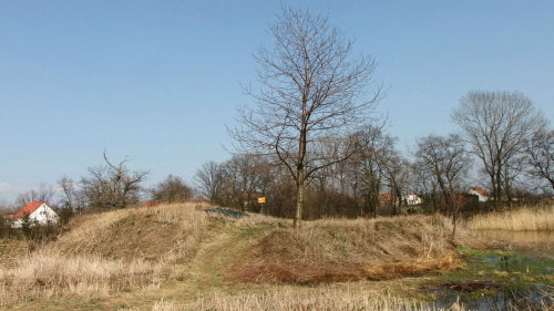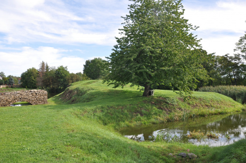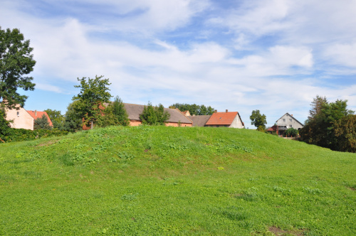 wieś z grodziskiem średniowiecznym z XIV w, otoczonym fosą, z pozostałością fundamentów wieży mieszkalnej.