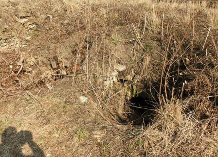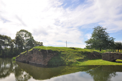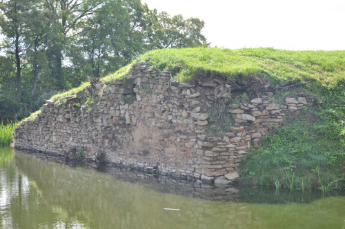 Z reliktów murowanych zachowała się piwniczka, do której wejście zakamuflowano folią, kamieniami i gałęziami i kilka mniejszych lub większych fragmentów murków. Jest też staw - pozostałość fosy. (fot. kwiecień 2013)