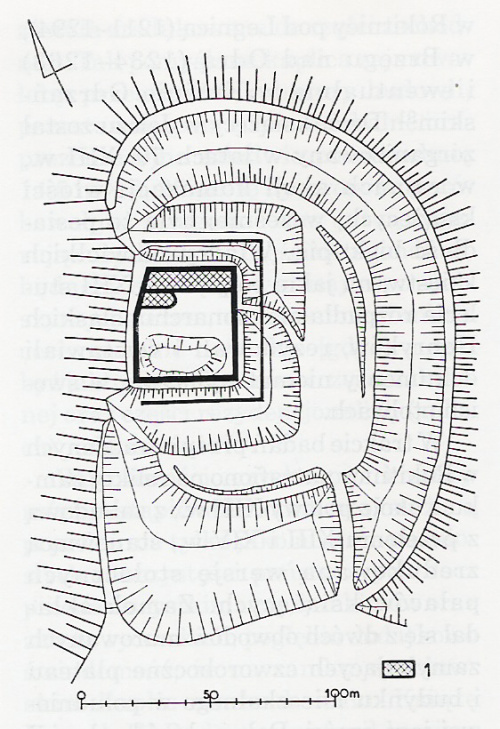 plan sytuacyjny z zaznaczeniem budynku mieszkalnego i kaplicy (1) z przełomu XIII/XIV wieku wg. E.Niemczyka 1972