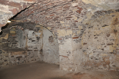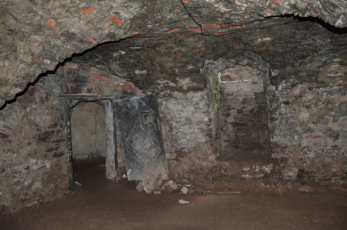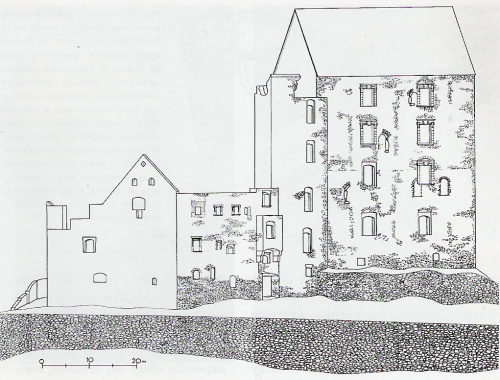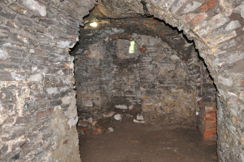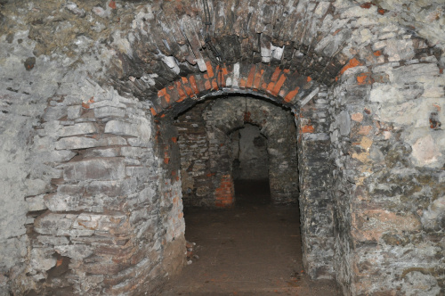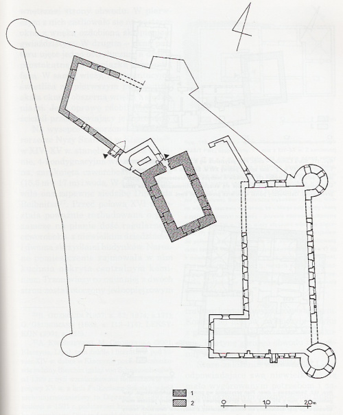 plan okolic wieży wg. J.Rozpędowskiego 1961, 1-mur z XIV wieku, 2-mur z XV wieku
