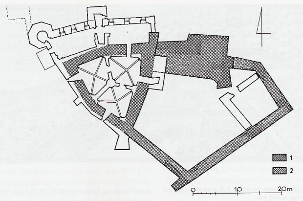 plan murów i fundamentów piwnic z zaznaczeniem murów odsłoniętych w trakcie badań wykopaliskowych wg. A.Kudła i M.Rodriguez 1980, 1-mury z I fazy potwierdzone w badaniach, 2-hipotetyczny przebieg murów z I fazy