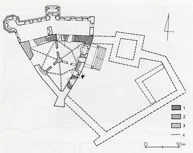 plan II kondygnacji z rozwarstwieniem chronologicznym wg autorki, 1-mur z I fazy, 2-mur z II fazy, 3-mur z III fazy, 4-rekonstrukcja