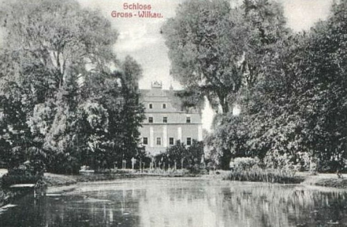 z kalenicą równoległą do osi podłużnej budynku. Całości dopełniały rozbudowane szczyty. Zachowane do dzisiaj są kamienne zdobione ornamentem okuciowym obramienia okienne w partii parteru oraz w pierwszej kondygnacji szczytów. Wzór ten powtarza się również w obramieniach wokół drzwi znajdujących się w sieni. Z okresu renesansowej przebudowy pochodzą również sklepienia w przyziemiu. Zachowany fragment dekoracji sgraffitowej w elewacji płd. wskazuje na formę dekoracji ścian zewnętrznych budynku. Prawdopodobnie w tym okresie wokół dworu pojawiła się fosa, po południowo wschodniej stronie posadowiono folwark a od południa wykopano mały staw. Po śmierci Nimitza, w latach 1640 – 1647 majątek przechodzi pod zarząd książąt brzeskich. W latach 1647 – 1685 właścicielem dóbr w Wilkowie jest Heinrich von Zierotin. Bezpotomna śmierć jego spadkobiercy w 1689 roku powoduje, że majątek ponownie trafia pod zarząd książęcy i pozostaje pod nim aż do 1694 roku. Wówczas Wilków przekazany zostaje rodzinie komorzego królewskiego – Hieronimusa von Scalviani. Wiek XVIII dla Wilkowa to zmieniający się co kilka lat kolejni właściciele. Od 1710 roku jest nim komendant twierdzy w Brzegu - Edward von Golloway, następnie rodzina von Gallardi. Od 1721 do 1725 majątek jest w rękach brzeskiego naczelnika krajowego – Franza Weigharda von Hoffmann. W dokumentach wymienione wówczas są : dom pański, folwarki, lenno kościelne stawy, młyny i karczma. Od połowy lat 20 – tych XVIII wieku dobra w Wilkowie należały do rodziny von Tschirsky. Prawdopodobnie wówczas dwór przebudowano ponownie, tym razem w duchu barokowym. Zatynkowano sgraffitową dekoracje, okna na II kondygnacji powiększono pozbawiając kamiennych obramień, narożniki podkreślono boniowaniem w tynku. Poziome podziały wyznaczały gzymsy oddzielające poszczególne kondygnacje, pionowe zaś – spłaszczone pilastry. Zmiany zaszły również we wnętrzu. Pojawiła się dekoracja sztukatorska w pomieszczeniach w przyziemiu i na II kondygnacji. Do dzisiaj zachowała się dekoracja reprezentacyjnej jadalni z kominkiem i sztukaterią. W 1751 roku majątek zostaje kupiony przez Karla Friedricha Pfeil z Przerzeczyna i pozostaje w jego rodzinie przez niemal wiek. Od 1842 roku właścicielem dworu jest Juliusz von Koschembar. W 1853 sprzedaje on dobra rodzinie von Chappuis, która pozostaje tu aż do 1927 r. W tym okresie następuje ostatnia duża przebudowa dworu. Pojawia się boczna klatka schodowa, wymianie ulega znaczna część stolarki okiennej i drzwiowej.