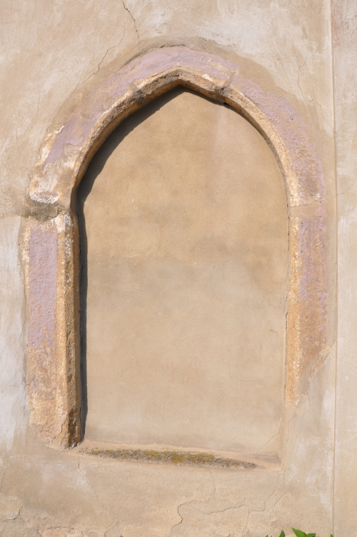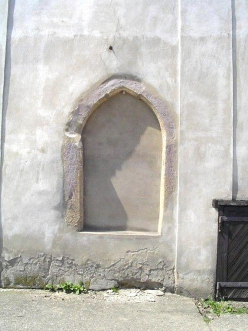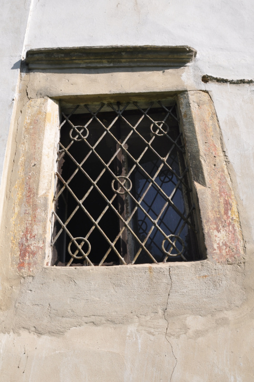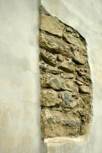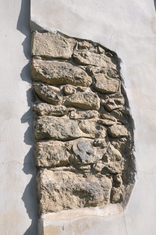 Oraz odsłonięty fragment muru pierwotnej budowli - wieży obronnej. Obok portalu i obramowania okna jedyne czytelne ślady po wieży.